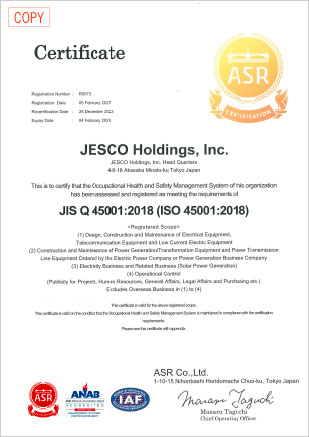In keeping with the corporate philosophy “FOR SAFETY FOR SOCIETY,” the JESCO Group champions the principle of putting the safety of the public and employees first and also engages in employee health management. As part of our efforts to systematically develop and implement these activities, we have obtained OHSAS 18001 management system certification.