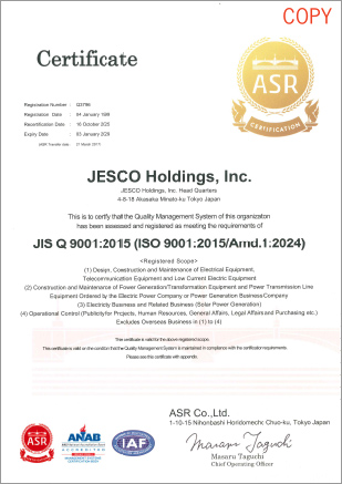 In keeping with the basic philosophy “Contributing to the creation of an affluent society where people can live with peace of mind,” the JESCO Group has developed an ISO quality management system and utilizes it as a means of providing high-quality products and pursuing enhancement of customer satisfaction.